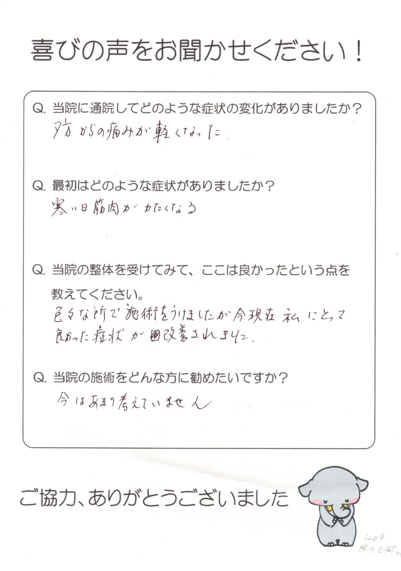 春日井市周辺在住:S.Yさん 70代女性 2025.05.24 慢性腰痛膝の痛みO脚 Q:当院に通院してどのような症状の変化がありましたか? 夕方からの痛みが軽くなった Q:最初はどのような症状がありましたか? 寒い日筋肉がかたくなる Q:当院の施術を受けてみて、ここは良かったという点を教えてください 色々な所で施術をうけましたが今現在私にとって良かった 症状が改善されました Q:当院の施術をどんな方に勧めたいですか? 今はあまり考えていません ※効果には個人差があります。 院長からのコメント ありがとうございます。 右足の外側にしびれや痛みが出るヘルニアのような症状でしたが、バランス整体と微弱電流エレサスによる治療でスムーズによくなり、安心しました。 これからは予防のために少しづつ運動も取り入れつつ、定期的なケアができれば良いですね!